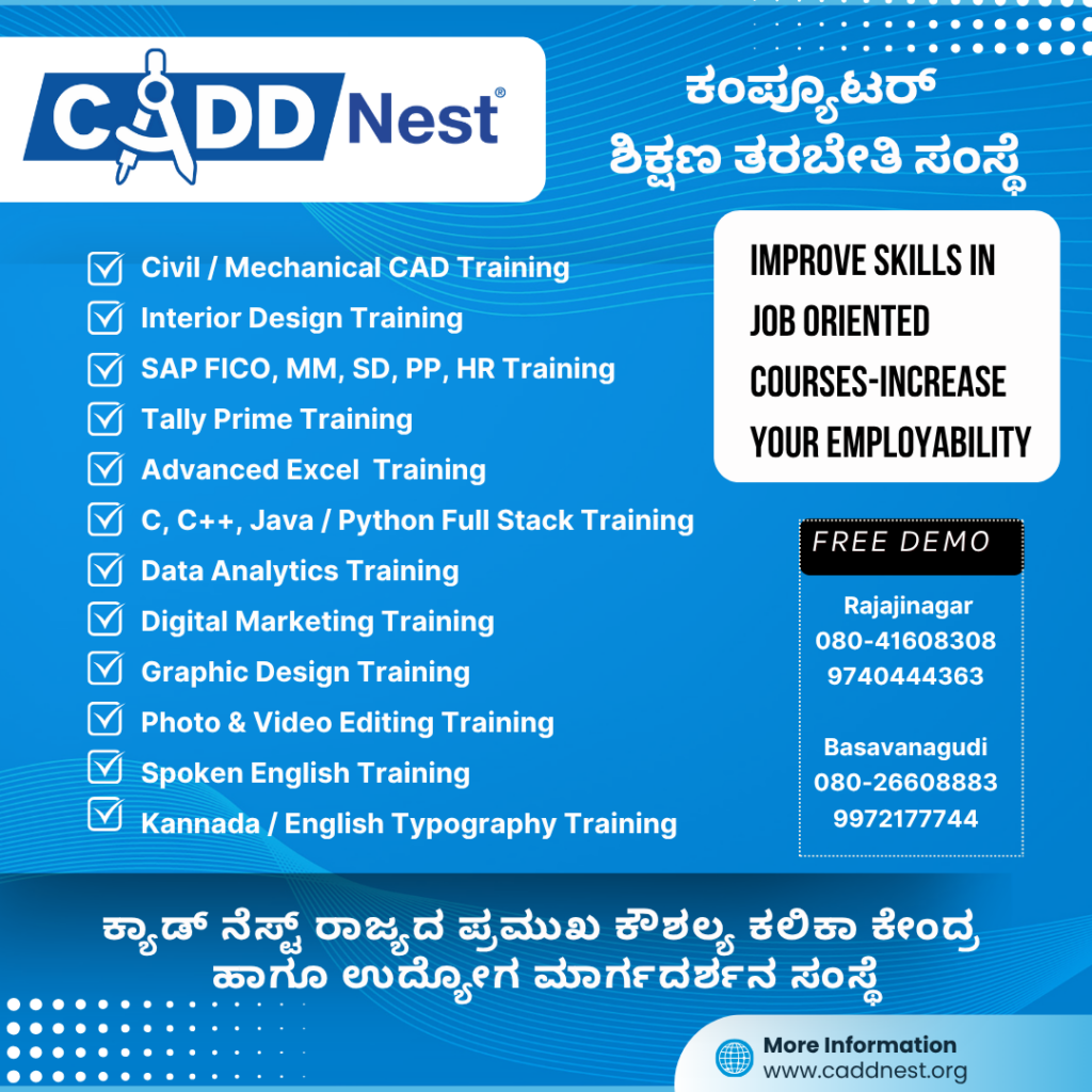 Among all options, CADD Nest Training Centre β Rajajinagar stands out as one of the best computer training institutes in Rajajinagar Bangalore.