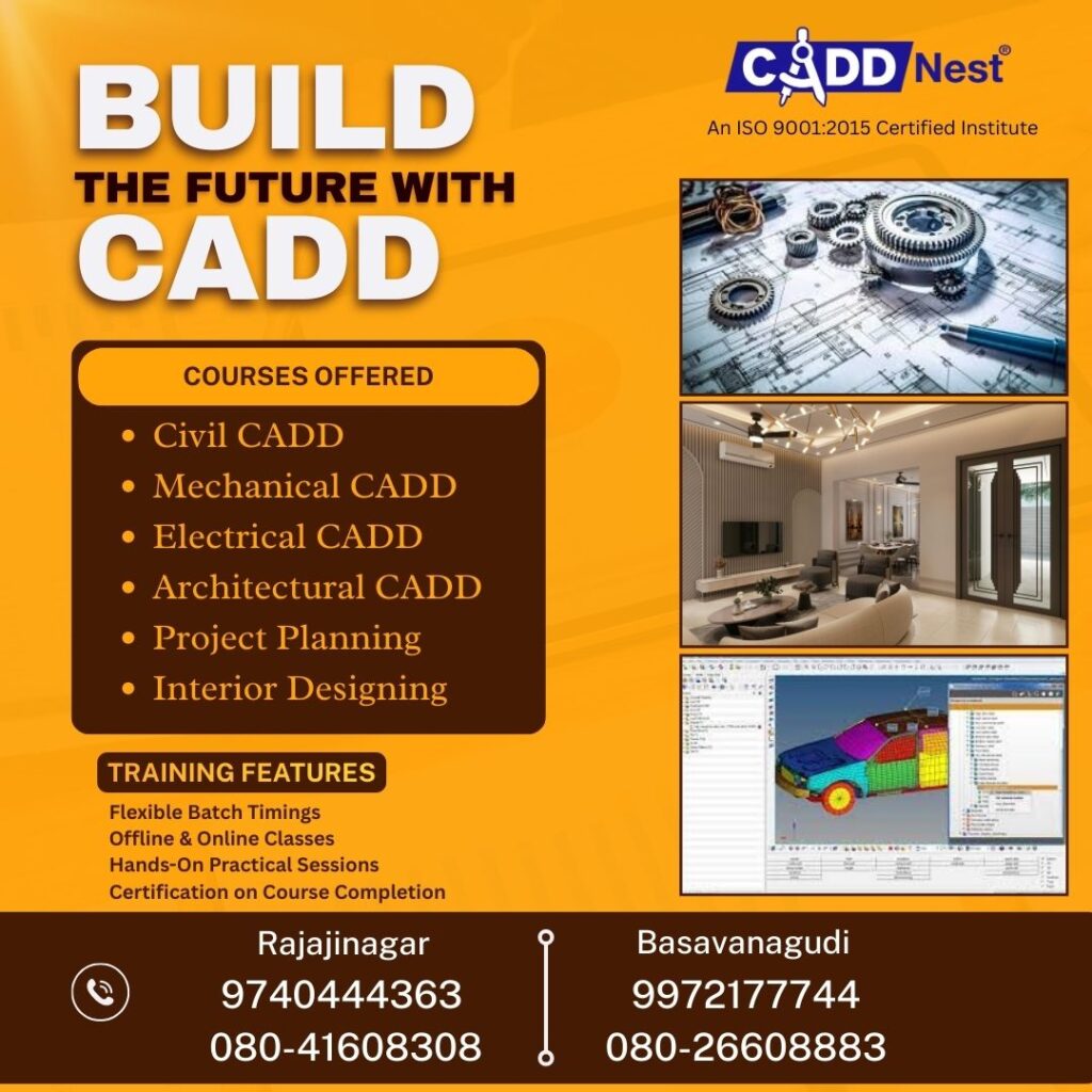 CADD Nest Training Centre offers professional CADD Training in Bangalore with industry-oriented courses including Civil CADD, Mechanical CADD, Electrical CADD, Architectural CADD, Project Planning, and Interior Designing.