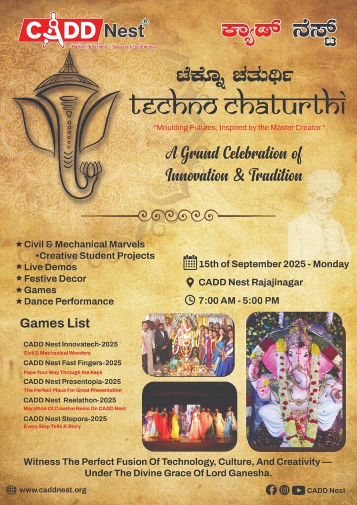 Get ready for an exciting event as Cadd Nest, Bengaluru’s premier skill development institute, hosts Techno Chaturthi 2025 at its Rajajinagar branch on September 15. This unique celebration combines the cultural richness of Ganesha Chaturthi with the professional essence of Engineers’ Day, offering a perfect blend of tradition and innovation for students and professionals.